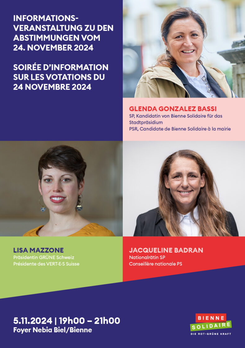 Nous sommes heureux·ses de vous inviter à une soirée d’information sur les votations du 24 novembre 2024. Nous aurons le plaisir d’accueillir, en plus de Glenda Gonzalez Bassi, deux politiciennes reconnues au niveau national :